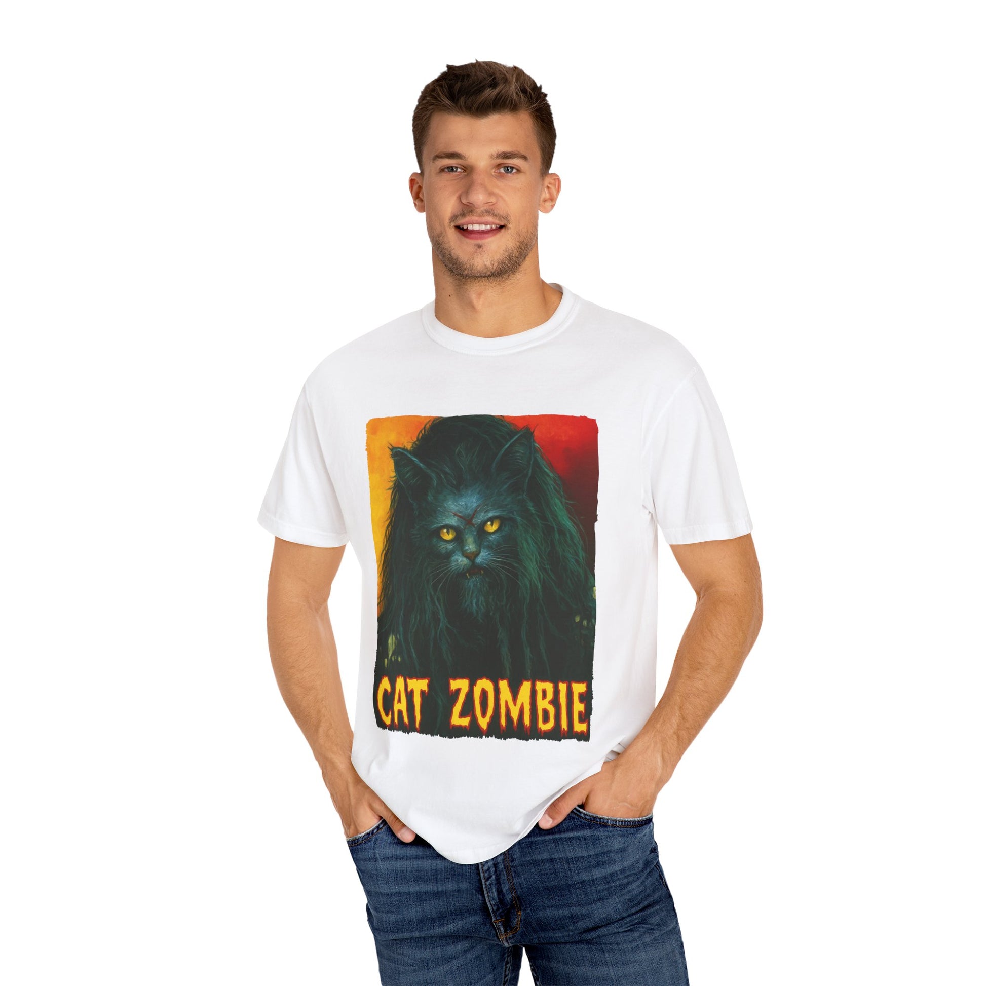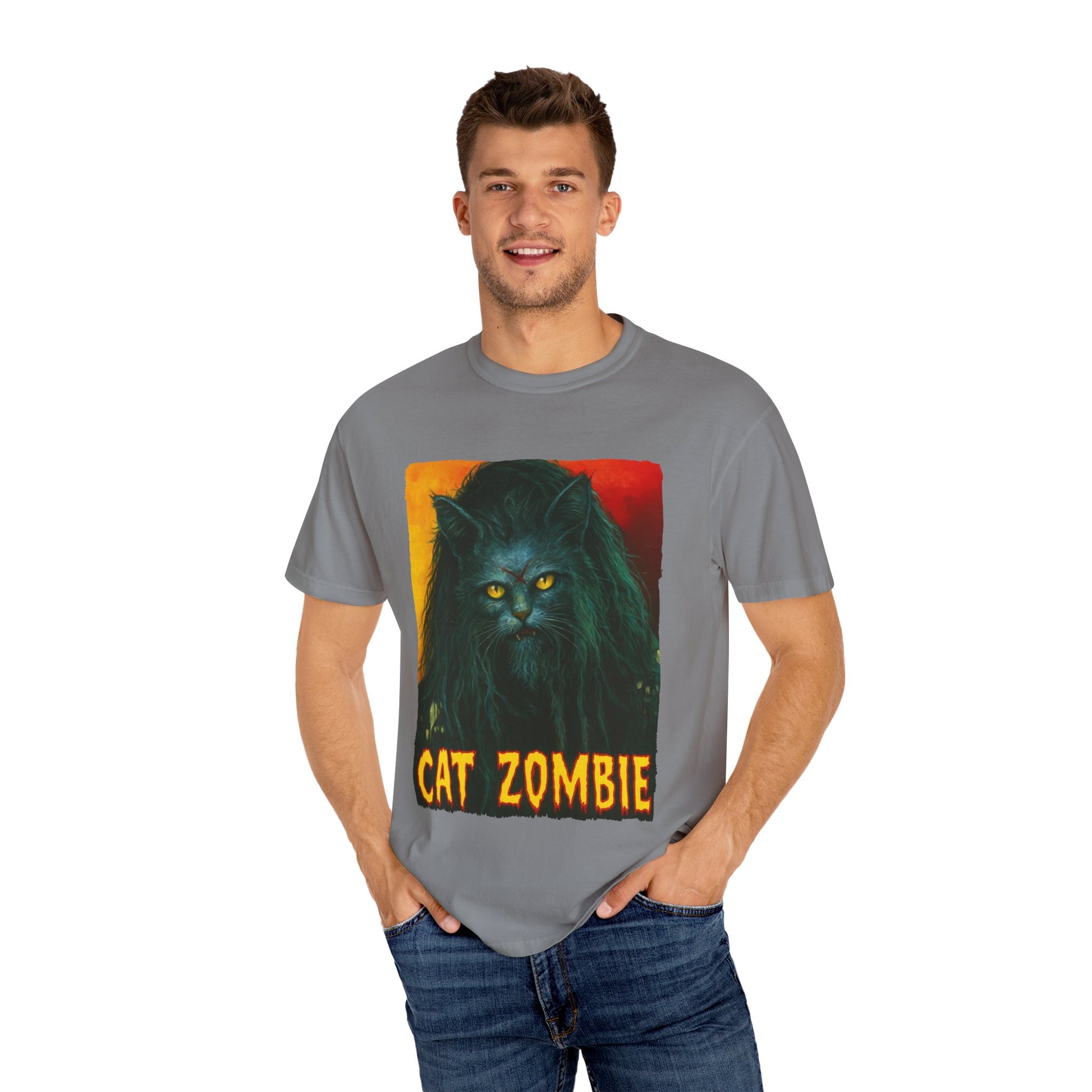 “Cat Zombie” pairs glowing eyes and a poster-style horror graphic with the soft, washed feel of a Comfort Colors® garment-dyed tee.