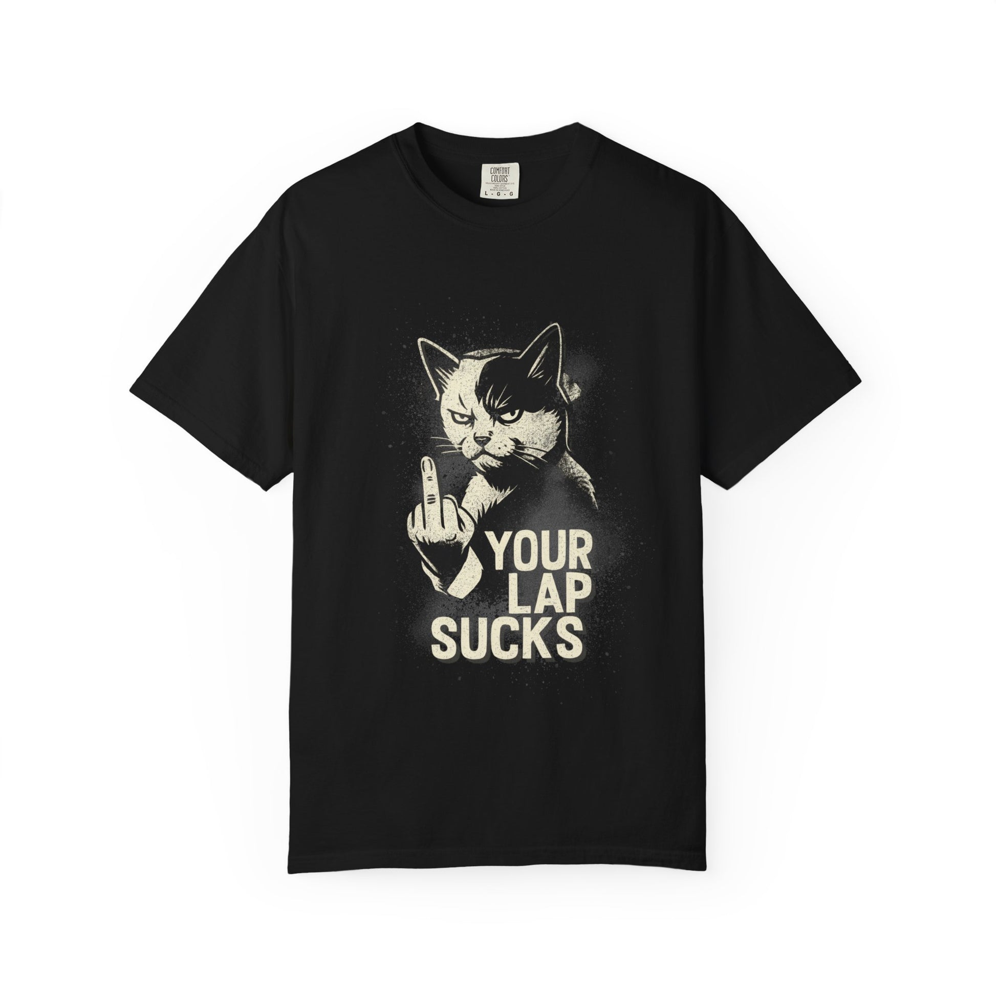 Black tee with a distressed red/white/gray graphic featuring an unimpressed cat and the text “YOUR LAP SUCKS.” Pairs with denim, cargos, or layered under a flannel for a throwback vibe.