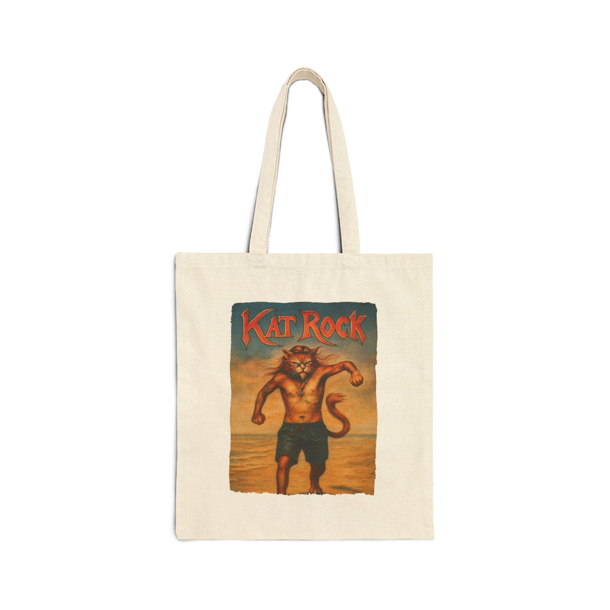 Turn every grocery run into a victory lap with the Kat Rock canvas tote. Bold headline type frames a sunset scene where a confident tabby strides out of the surf—equal parts parody poster and summer anthem. Printed on natural 100% cotton canvas, this reusable bag folds flat, carries more than it looks, and keeps the artwork crisp through everyday use. Perfect for cat lovers, music fans, and anyone who appreciates tongue-in-cheek art.