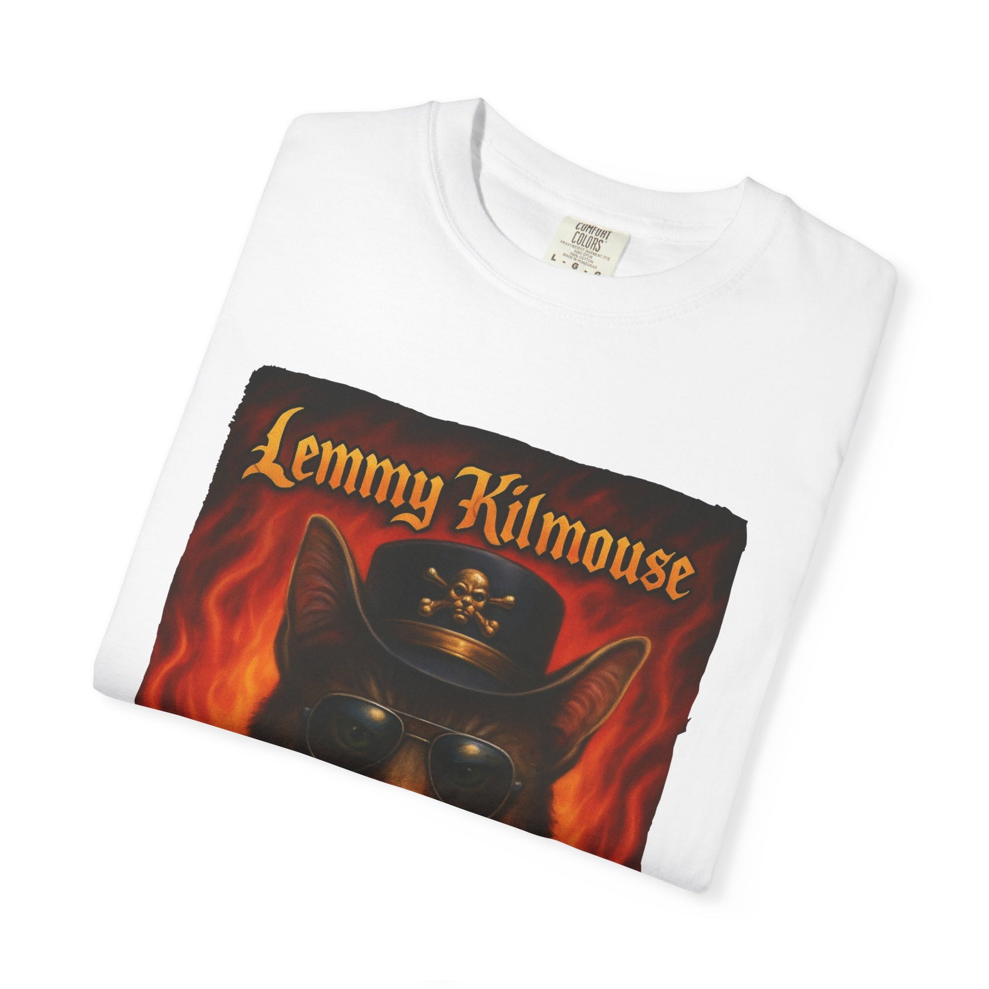 Turn up the bass purr. “Lemmy Kilmouse” features a cool-as-steel cat in aviators and captain’s cap, set against roaring flames—a playful nod to classic rock iconography. It’s printed in crisp detail on the fan-favorite Comfort Colors® tee for that broken-in feel from day one.