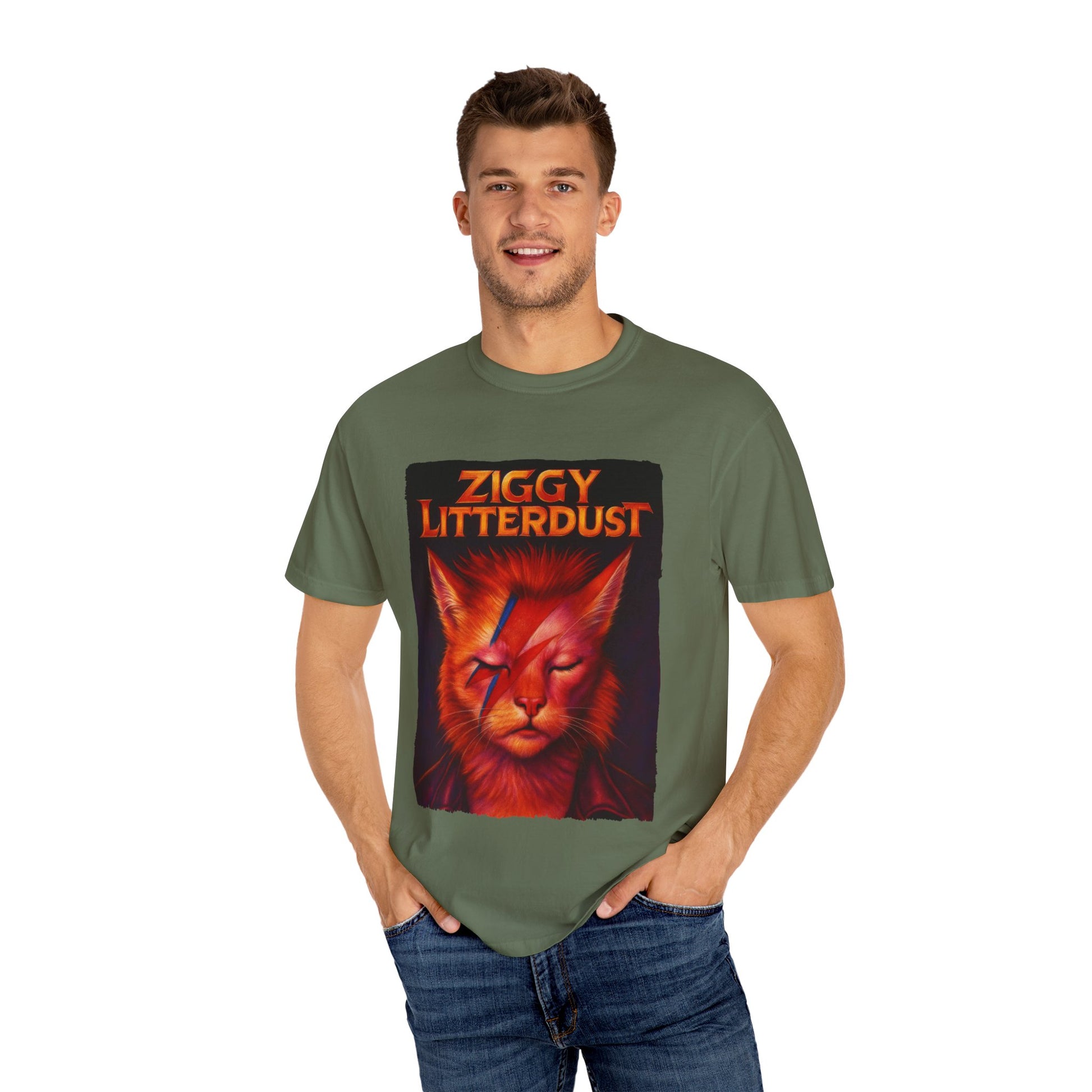 “Ziggy Litterdust” shines with a glam-lightning cat portrait on the soft, broken-in Comfort Colors® garment-dyed tee.